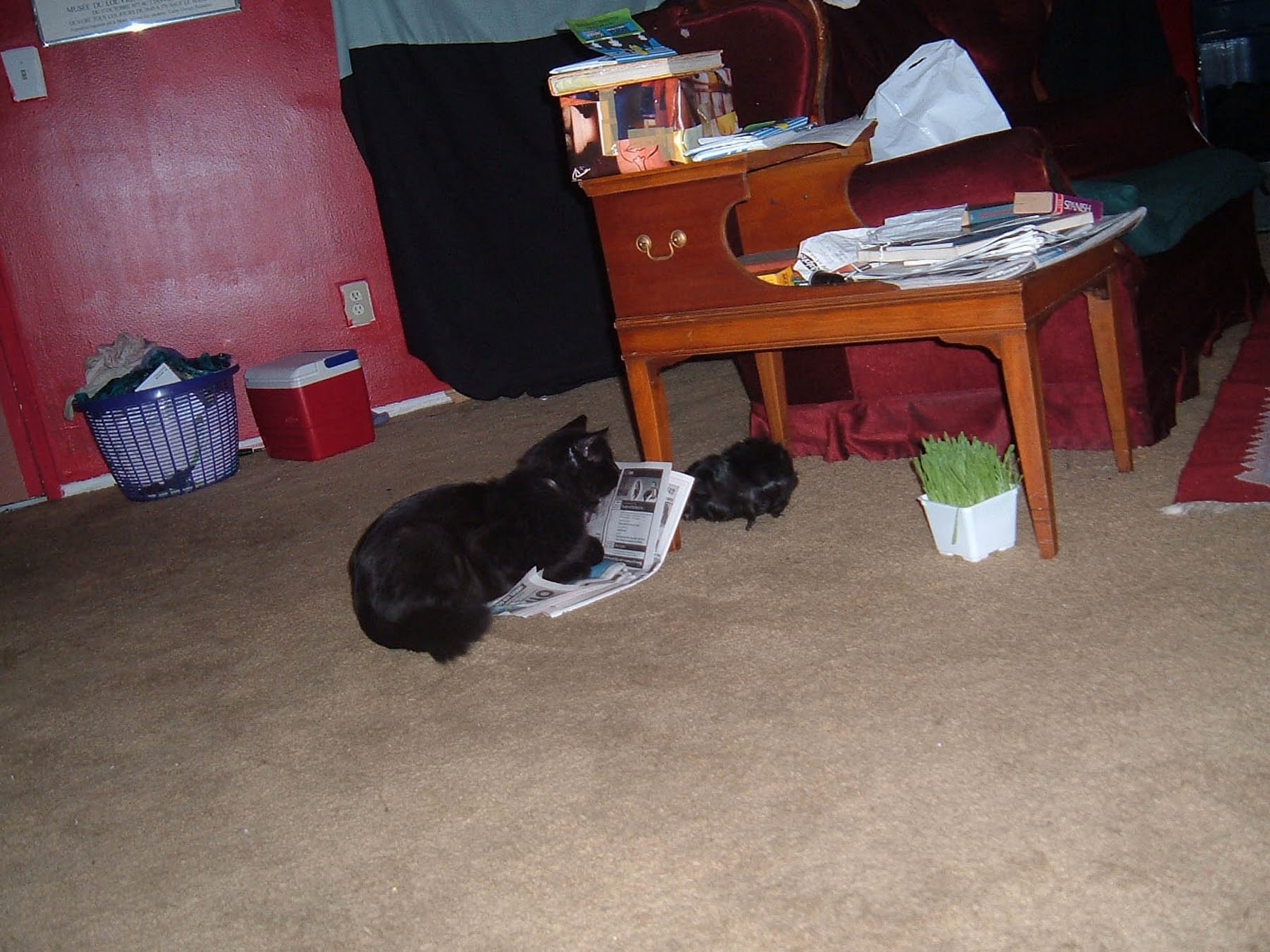 A little grass, a little newspaper, a little freedom... just gotta keep an eye on the black little puff-ball nosing around |