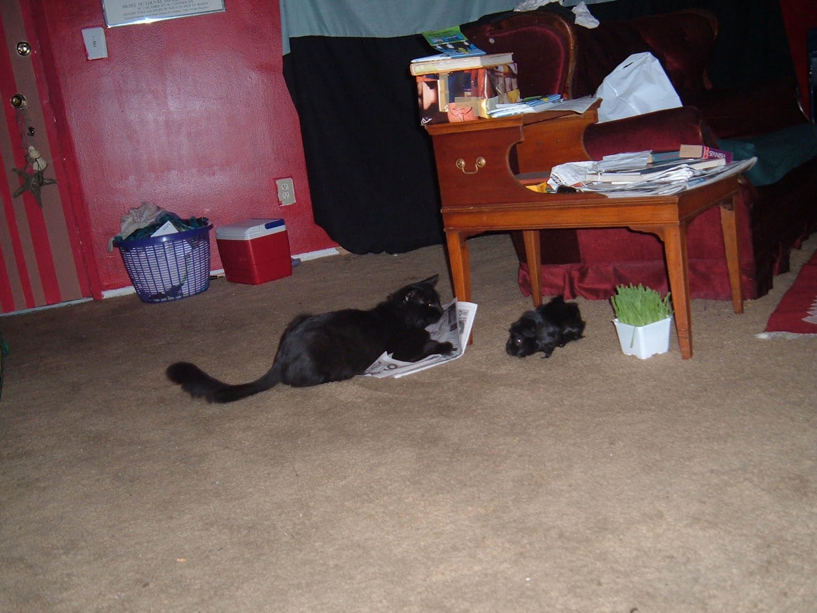 To continue chronicling the beautiful-and-sometimes-startling relationship between Koomyn the cat and Bijou the guinea pig, I am providing for your pleasure a sequence of pictures that I took some 5 or 6 years ago, right after we moved to CA. We had just driven nearly two full days south from WA state to Los Angeles, CA, bringing one very dazed and confused cat and one supremely indifferent guinea pig into the home of Jenni, my sister-in-law. Koomyn had kept up a low, moaning