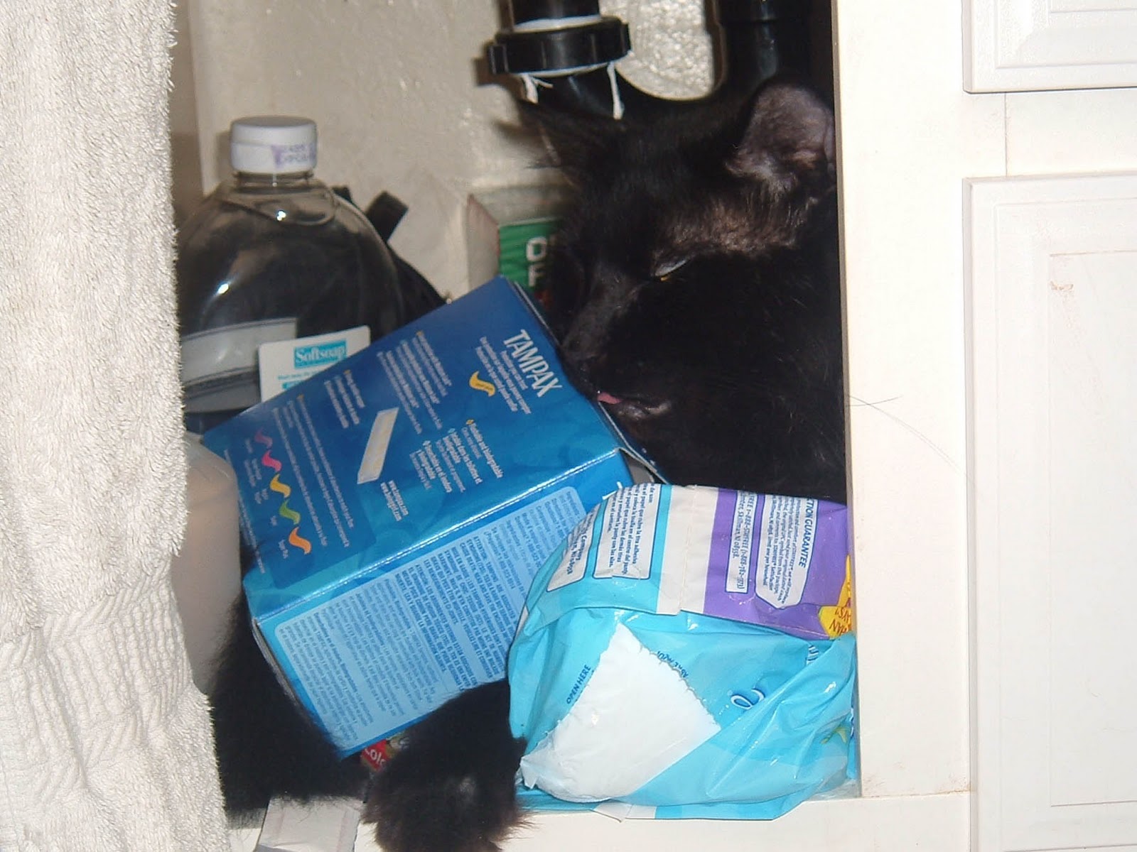 Koomyn climbed under the bathroom sink in our North Hollywood apartment to escape the heat of high summer. Poor baby. |