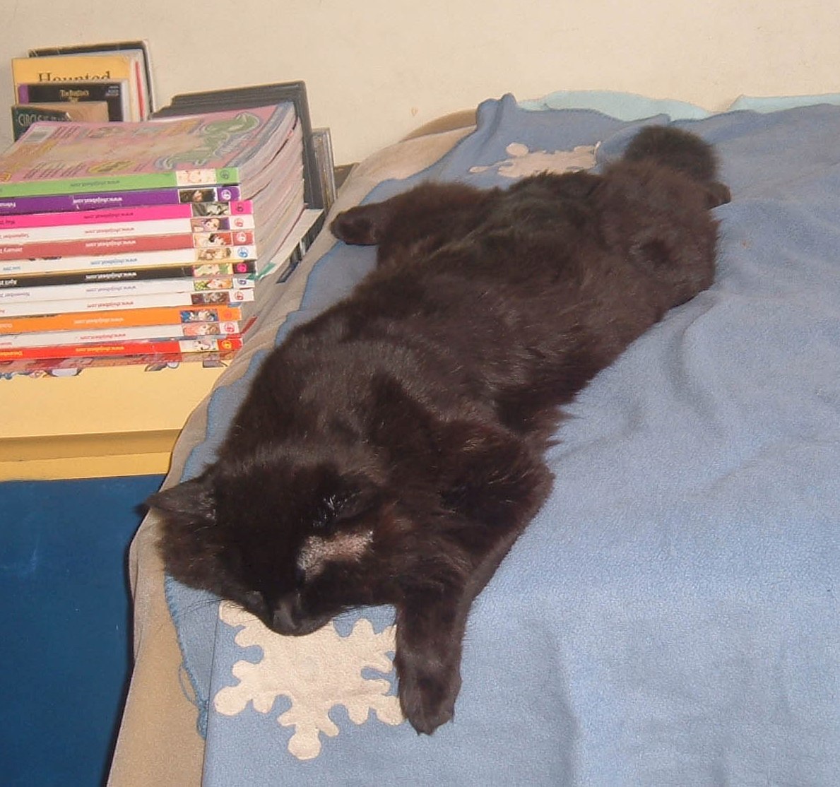 He grew up big and black, with changeable yellow-gold eyes and the sweetest disposition ever. What a cuddler; when I came home from work and plopped down on the bed, he would immediately climb up on my chest and settle down. If I was tilted at an awkward angle, he'd just stick out his back leg and balance while pinning me with that slitted stare, until I got the message and resettled appropriately. Then if I didn't start scratching and petting quickly enough, his nose and tongue would gently nudge my chin. If that didn't work, his head would begin butting against it, until he had my head forced sideways, trapped under his great, wide cheeks, where he would settle happily. Defeated, I would have to begin the adulation he deserved for putting up with all the shit he put up with during the day from my kids.