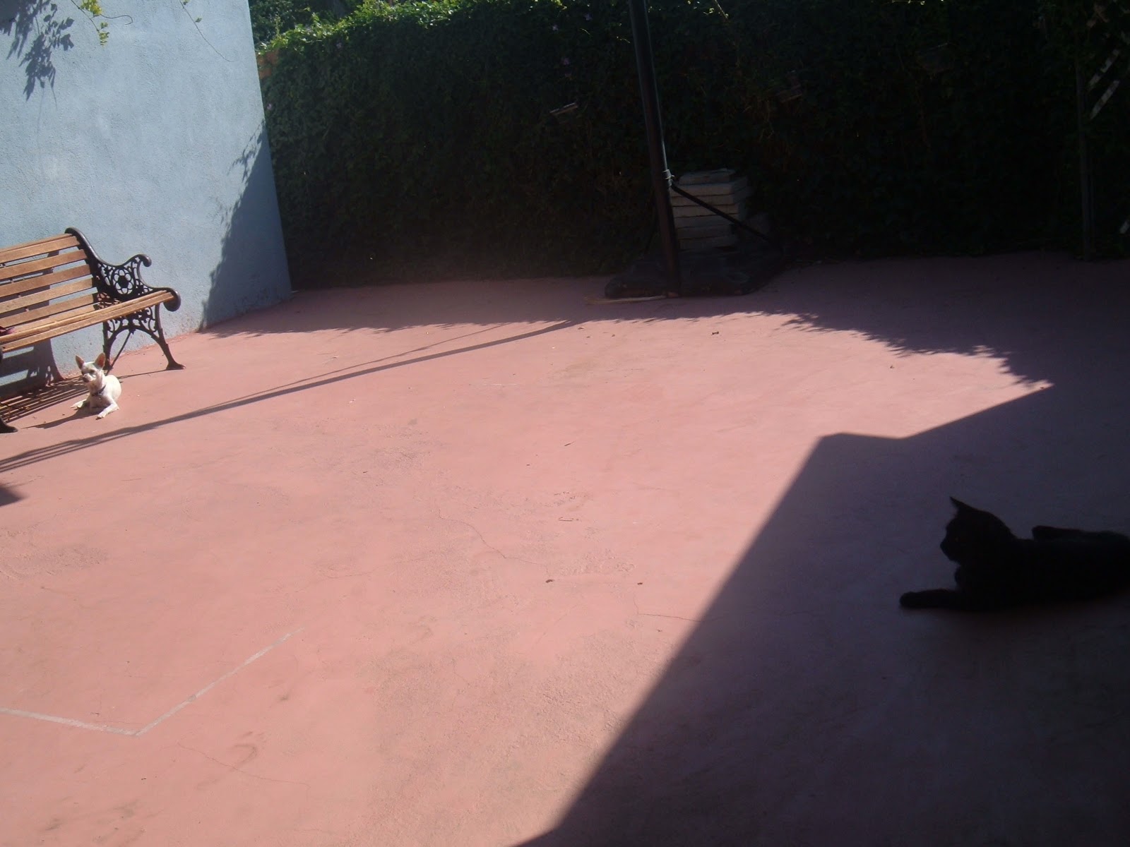 Guarding the shady spots against encroachments. Poor Bunn (little white dog on the left) was actually smaller than Koomyn. Wasn't much of a contest. |
